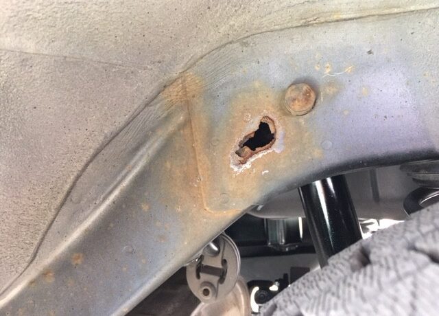 車検整備でご入庫いただいた お得意様の‘‘Mさん‘‘のワゴンR!! 後ろのフレームが錆びて穴あいちゃってますよ(>_<) う?ん。これだと車検パスできませんね?(;一_一) こちらは左の後ですが。。。。 反対側も同じように穴開いてますし泣 ‘‘Mさん‘‘に相談して 修理することにしました!! 今回は、あまりお金のかからない方法で修理できました笑 次の車検までには、お乗り換えをご検討くださいね!! ご利用ありがとうございました(*^_^*)