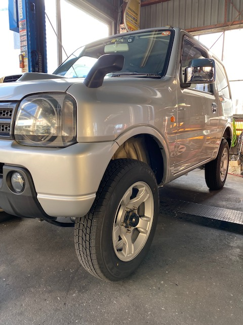 「スプリングを数センチ上がる社外のスプリングに交換して、ショックアブソーバーは現行64ジムニーの純正品に交換してあるとのこと。」