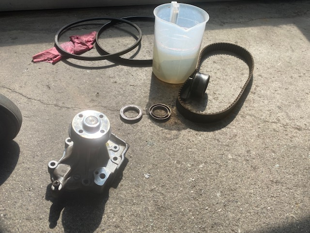 ↓手前から交換済みのウォータポンプ、オイルシール2個、タイベル&テンショナー、ベルト各2本